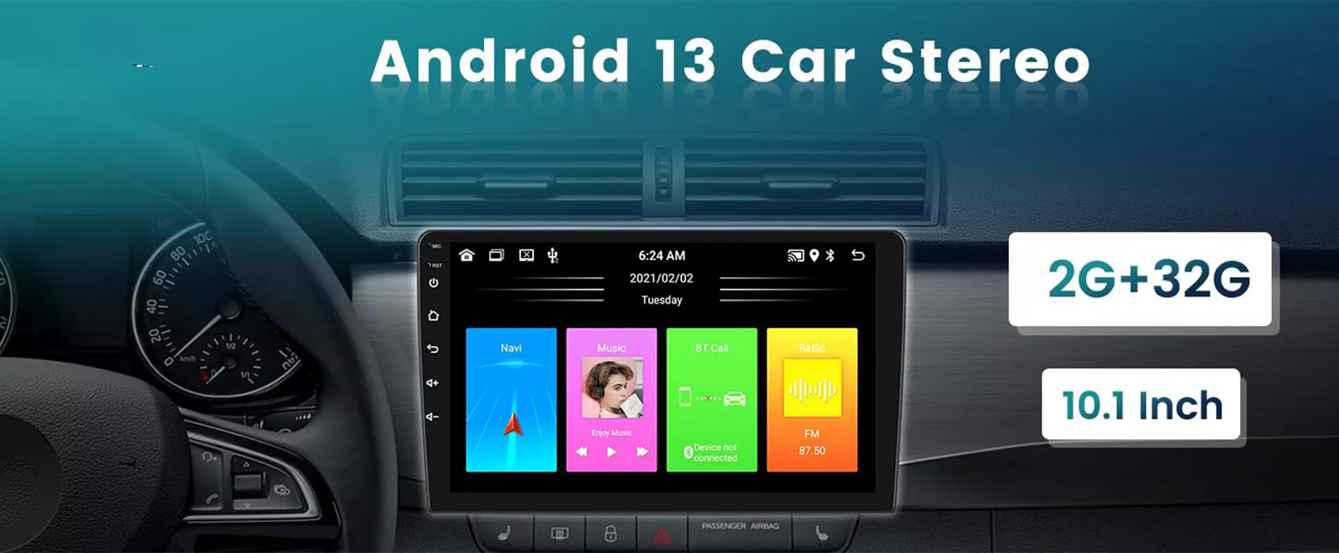 - Android 13 Car Stereo: Latest Android car radio, 10-inch double-DIN car stereo receiver, 2GB RAM, 32GB ROM, quad-core processor. The 2.5D tempered glass touchscreen head unit offers 13 themes with customizable wallpaper, EQ, and brightness. Supports subwoofers and amplifiers.